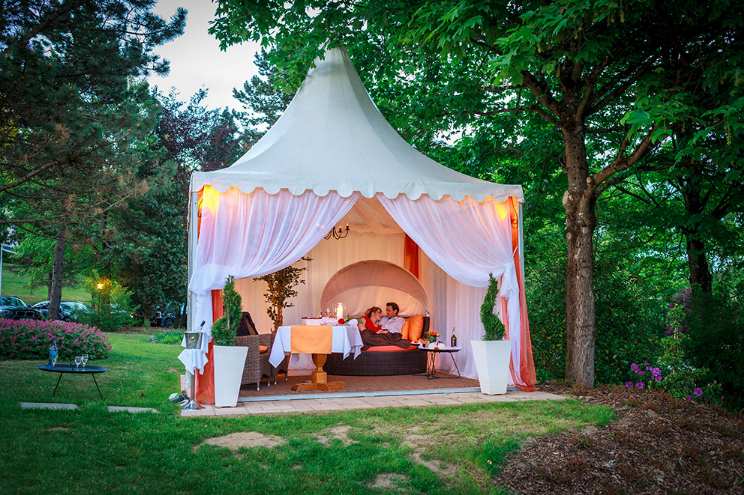 Ob als einzigartiges Erlebnis zum Hochzeitstag, als perfekte Umrahmung für Ihren Heiratsantrag oder einfach nur ein romantischer Abend zu zweit - unser Romantik Pavillon ist exklusiv für Sie reserviert. Fühlen Sie sich wie in der Toskana bei einzigartigem Ausblick in Mitten von Franken. Genießen Sie ein mediterranes 4 Gänge Romantik Menü. Erleben Sie den Sonnenuntergang und Sternenhimmel hautnah. Lassen Sie den Abend im Romantik Pavillon ausklingen und übernachten Sie anschließend in unserem Hotel.
